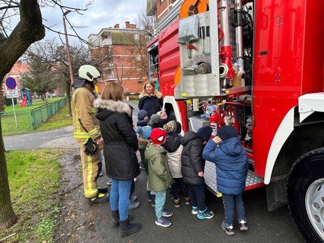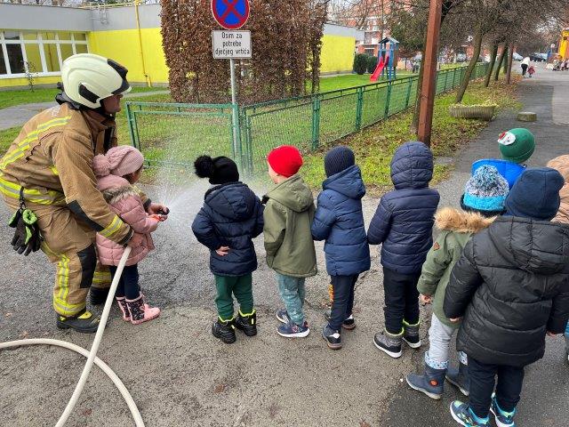 Povodom dana Otvorenih vrata našeg vrtića, srednju B skupinu objekta Maslačak posjetio je Mijin tata po zanimanju vatrogasac i djelatnica Vatrogasne postrojbe Kutina. U skupini su djeci predstavili svoje zanimanje vatrogasca i na koje načine pomažu ljudima u nevolji. U dvorištu vrtića prezentirano je vatrogasno vozilo i oprema koju vatrogasci koriste na intervencijama. Djeca su uživala isprobavati vatrogasne kacige, sjedati u vatrogasno vozilo, gledati vodu i pjenu koja gasi požare.