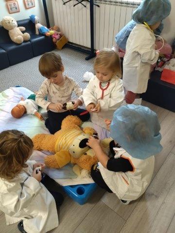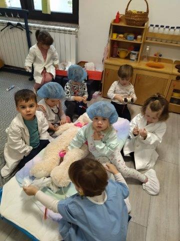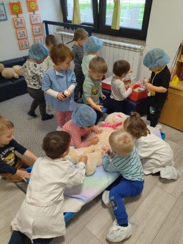 Nakon čitanja slikovnice „Murko na snijegu“, s djecom naše skupine razgovarale smo o tome kako možemo pomoći promrzlom zečiću. Jedan od odgovora je bio da ga možemo odvesti doktoru. To nas je potaknulo na formiranje kutića liječnika u čemu su nam pomogli i roditelji sakupljanjem i donošenjem raznovrsnog materijala za igru. Djeca su ponuđenim materijalima organizirala razne simbolične i imitativne igre (igre pretvaranja) kroz koje su se uživljavala u uloge likova te proigravala vlastita iskustva.
