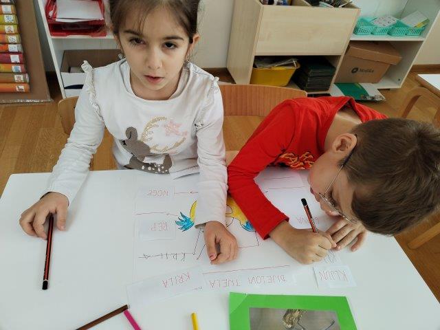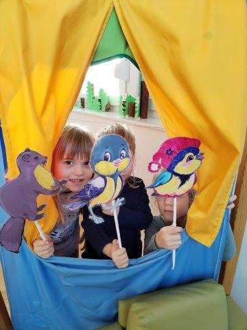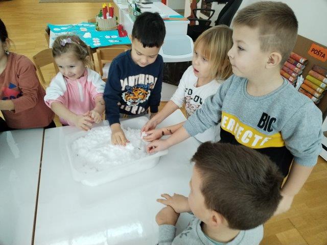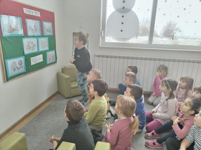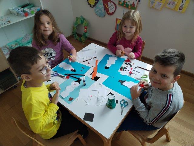 Promatrajući snijeg koji nas je obradovao u prvim danima ove godine, nastale su i neke neplanirane aktivnosti potaknute interesima djece. Tako su naše panoe krasili likovni radovi „Snjegovića“, kojeg su djeca vješto izradila od kolaž papira. Razgovor o zimi potaknuo nas je na razmišljanje kako je pticama zimi. Kroz prigodne priče i pomoću raznovrsnih fotografija ptica, djeca su usvojila neka nova znanja pticama. Tako je nastao plakat „Dijelovi tijela ptice“ ; „Ptice stanarice i ptice selice“. Izradili smo plošne štapne lutke iz priče „Razbojnik sa žutom pjegom“, nakon čega su nastale i male scenske improvizacije. Djeca rado provode vrijeme u centru slikovnica, koji smo obogatili još jednom pričom u slikama na već spomenutu omiljenu priču o „strašnom razbojniku“.