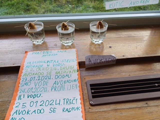 Koštice avokada su nas potakle na istraživačku aktivnost i pokušaj uzgoja vlastitog avokada. Koštice smo stavili u vodu te ih promatramo, zapisujemo promjene i zapažanja, mijenjamo vodu i iščekujemo nove rezultate.