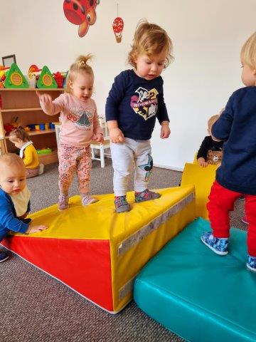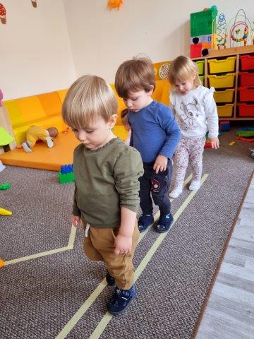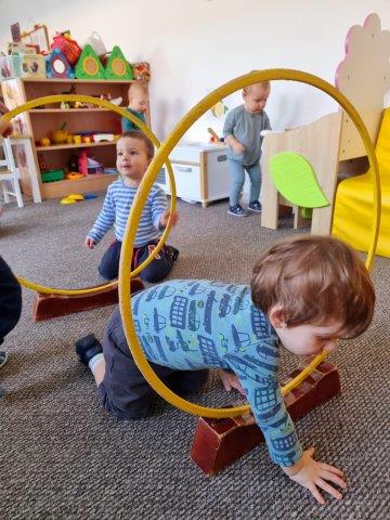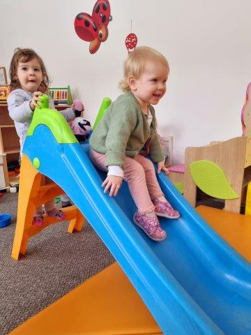 Tako ujutro, prije doručka, provodimo s djecom jutarnju tjelovježbu i razgibavanje kroz različite imitativne igre. Motoričke aktivnosti provodimo pomoću švedskih i wesco elemenata,obručeva na stalku, strunjače i manjeg tobogana koji pružaju sigurnost i zaštitu djeci pri izvođenju motoričkih zadataka. Djeca na ovaj način pužu, hodaju sa zadatkom čučnja, podizanja jedne noge s podloge, vježbaju ravnotežu, koriste ruke i dlanove, kako bi što bolje i sigurnije izvela neki motorički zadatak. Najveći interes i najveća pažnja djece je na malom, plastičnom toboganu.