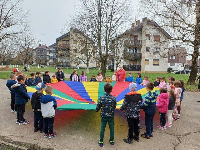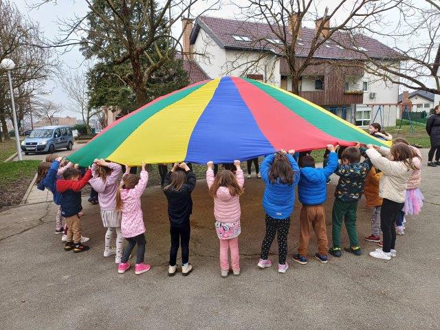 Djeca starije i mlađe skupine Košute na boravku na zraku igrali su se sa šarenim padobranom. Padobran je kod djece izazvao veliki interes te smo ga na početku svi zajedno primili, dizali i spuštali, a nakon toga smo dali djeci zadatak da ispod njega pretrče prije nego se skroz spusti. Na kraju smo stavili šarene loptice u njega i bacali ih u vis.