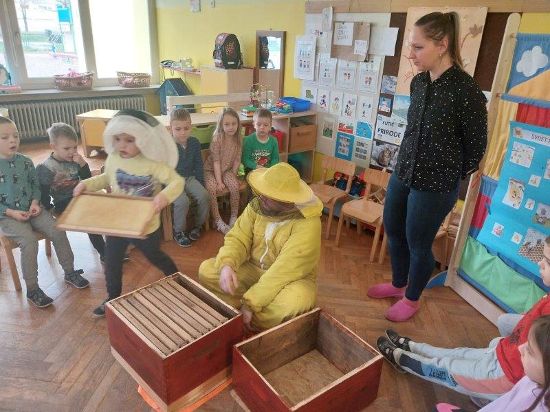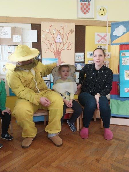Tata Tomislav stigao je obučen u pčelarsko odijelo s praznom košnicom i saćem, što je odmah privuklo pažnju djece. Cilj posjeta bio je upoznati djecu s procesom proizvodnje meda i ulogom pčela u tom procesu. Djeca su bila oduševljena kada su im roditelji demonstrirali košnicu sa saćem i slikovito opisali kako se radi med. Dječak Luka je sa majkom Majom prezentirao izrađeni plakat o putu pčela od cvijeta do meda .Nakon prezentacije majka je djeci pročitala slikovnicu „Pčelica Jelica“ i svoj djeci su podijelili teglice meda.