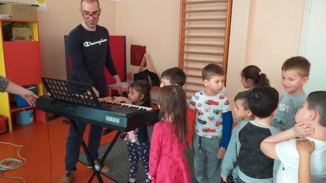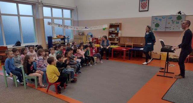 Nakon kratkog upoznavanja, učitelj Tomislav odsvirao je djeci nekoliko, njima poznatih, dječjih pjesmica: „Jesenska“, „ Padaj, padaj snježiću“, „Fašnički ples“, „Ja sam muzikaš“, „Vrapčić u zimi“ i „Zvončići“. Sva su djeca oduševljeno pjevala i pljeskala nakon svake pjesme.
