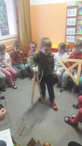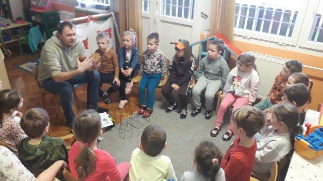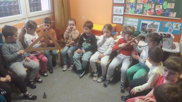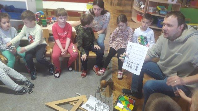 Srednja C odgojna skupina Nevena ove se godine ističe velikim odazivom roditelja na suradnju i druženja. Prošli tjedan skupinu je posjetio gospodin Ivan Bodiš, otac dječaka Karla. Karlov tata je profesor matematike u Tehničkoj školi u Kutini. Stoga je za djecu pripremio zanimljivo i edukativno druženje tijekom kojega je djecu upoznao s geometrijskim tijelima i oblicima. Djeca su imala priliku vidjeti veliki školski šestar i trokut te su s njima manipulirala, opipavala ih, promatrala i opisivala. Nakon uvoda u određene matematičke pojmove, otac je djecu pozvao na igru za koju im je izradio maštovite didaktičke spajalice od drvenih špatula. Zadatci su bili izazovni i zanimljivi, stoga je i interes djece bio velik i dugotrajan. Sparivanje i pridruživanje prema zadanom kriteriju zahtijevao je od djece primjerenu pažnju jer se tražilo pronalaženje i spajanje istih oblika i boja. Djeca su si međusobno pomagala i upućivala jedni druge u ispravna rješenja postavljenih matematičkih zadataka. Obzirom na interes djece i njihove razvojne mogućnosti i narednih dana ćemo nastaviti s ovim i drugim matematičkim izazovima.