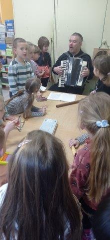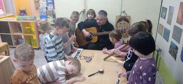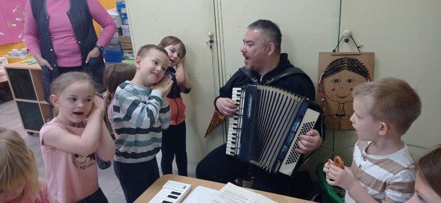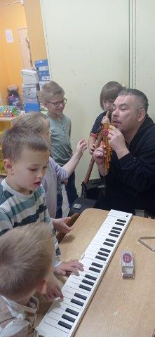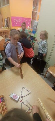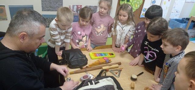 U skupini nas je posjetio Vinkin tata, gospodin Jasenko Horvat. Djecu je upoznao sa mnoštvom instrumenata, a s nekima smo se susreli po prvi put kao što su indijanska i peruanska frula. Istraživanje tih instrumenata izazvalo je najdužu pažnju kod djece. Od ostalih, djeca su imala priliku istraživati zvuk šuškalica, kastanjeta, triangla, harmonike, gitare, malog bubnja, sintesajzera i male muzičke kutijice. Došla su do raznih zaključaka pa su tako primjetila kako zvuk duže putuje s većeg triangla , a duže "cjevčice " bambusa na peruanskoj fruli ispuštaju dublji ton. Prepoznali su skladbu "Sretan rođendan" kada su okretali ručicu male muzičke kutijice te su zajedno spontano zapjevali. Uz gospodina Jasenka su djeca zapjevala poznate dječje pjesmice dok je svirao harmoniku. Dio djece je spontano uzeo neke od instrumenata u ruke i u ritmu počeo pratiti sviranje skladbi na harmonici. To je primijetio i Vinkin tata pa ćemo dogovoriti i novu suradnju u obliku glazbene radionice gdje će djeca obogatiti i proširiti svoja znanja i iskustva. Zahvaljujemo gospodinu Horvatu na suradnji i posjetu!
