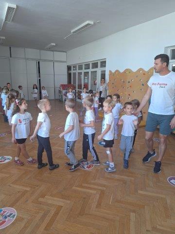 Hrvatski olimpijski dan su djeca starije C skupine objekta Neven obilježila suradnjom sa Antinim stricem, gosp. Stanislavom Barunom, fitnes trenerom. Susret smo započeli boravkom u sobi dnevnog boravka gdje je trener Stane s djecom razgovarao o važnosti vježbanja, pravilnoj prehrani, vodi te kako to sve utječe na kosti, mišiće, organe, odnosno na cjelokupni čovjekov organizam. Djeca su se u razgovor aktivno uključivala nabrajajući koju zdravu hranu jedu, koje organe i dijelove tijela poznaju te kojim se sportovima bave ili se u budućnosti žele baviti. Susret smo zatim nastavili u dvorani vrtića gdje je Antin stric pripremio za djecu vježbe primjerene njihovoj dobi i razvojnim mogućnostima.