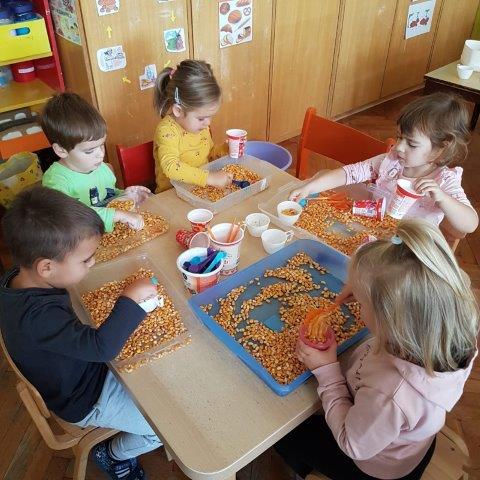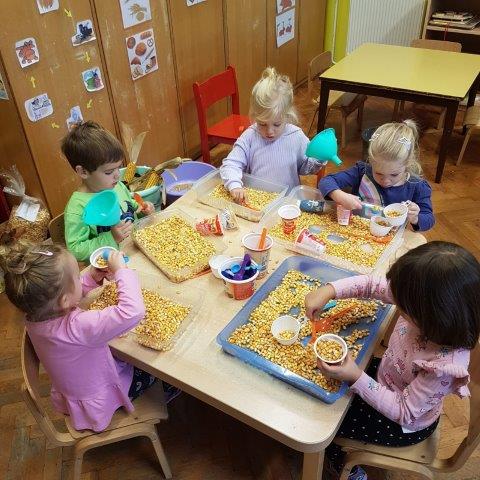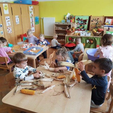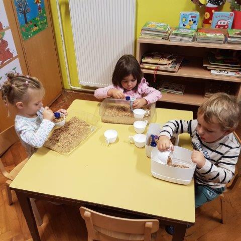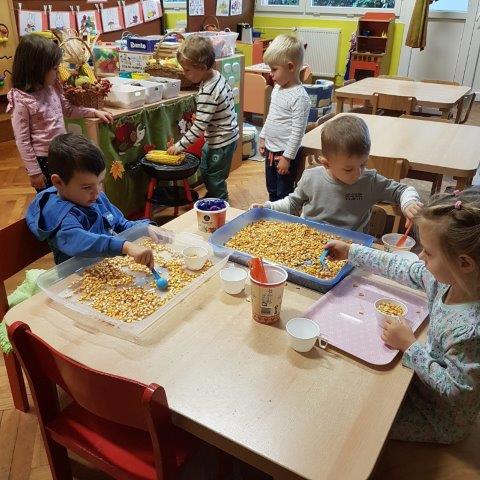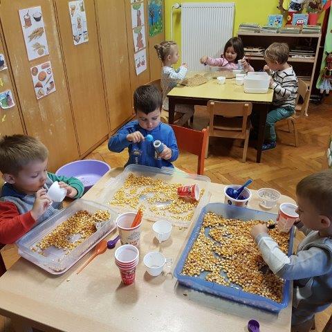 U mlađoj B skupini Nevena oformili smo centar jeseni kojeg smo bogato opremili u suradnji s roditeljima. Djeca su najviše interes pokazala za raznovrsne igre kukuruzom i zrnjem. Sa klipa kukuruza trgali su komušinu, igrali se igara pretvaranja „Pečemo kukuruz“, manipulirali zrnjem, punili i praznili razne posudice, presipavali zrnje te istraživali odnose puno-prazno, više-manje.