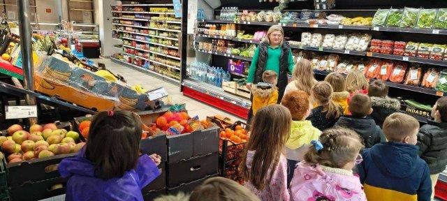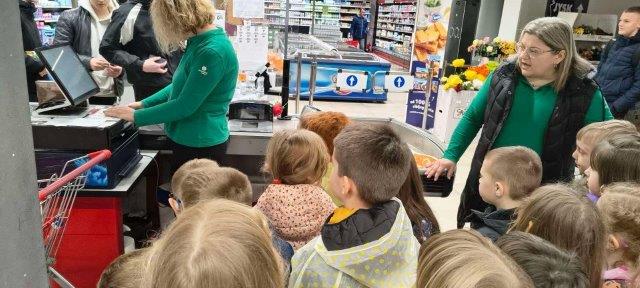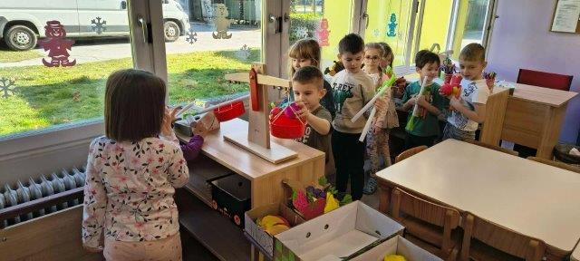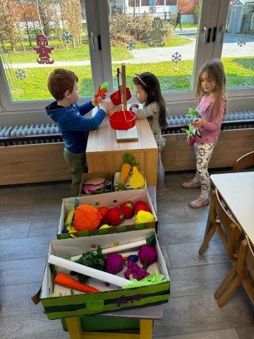 Na radnom roditeljskom sastanku, roditelji su izradili voće i povrće kako bi obogatili novooformljeni kutić trgovine/tržnice za koji su djeca pokazala veliki interes. Kroz simboličku igru djeca su se izmjenjivala u ulogama prodavač-kupac. Svakodnevno su kupovali/prodavali namirnice, vagali voće i povrće te su prepričavali iskustva odlaska u trgovinu s roditeljima. U suradnji s mamom Grgić, posjetili smo ju na radnom mjestu – u trgovini Studenac. Gđa Grgić nas je provela kroz trgovinu te pokazala skladište trgovine, pekaru, upoznala nas s poslom trgovca – koje sve obaveze ima tijekom dana te je pokazala sobu u kojoj se nalaze ekrani na kojima prati što se događa u trgovini. Na kraju nas je počastila sa slatkišima.
