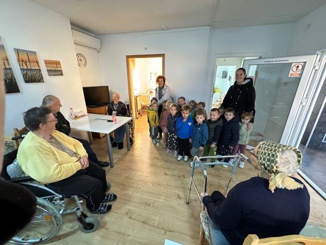 Srednja skupina Sunca posjetila je Dom za starije - obiteljski dom Jurković. Djeca su se družila s korisnicima doma te su svi zajedno otpjevali par pjesmica.