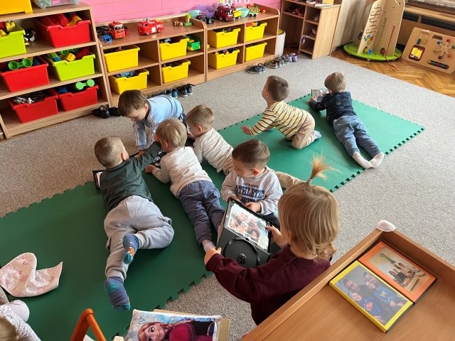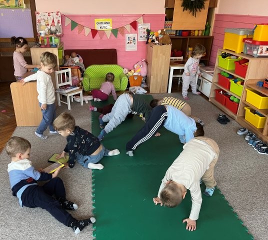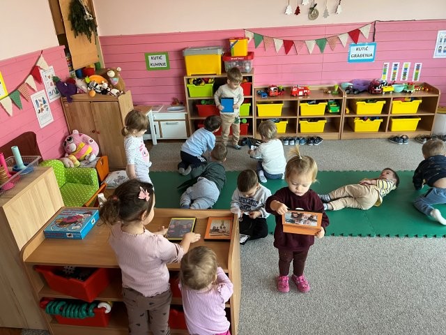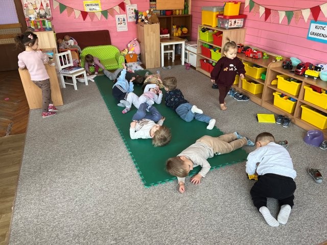 U našoj jasličkoj skupini male tjelesne aktivnosti ponovo su potaknule dječji interes i znatiželju. Kroz senzornu priču, djeca su imala priliku kretati se, istraživati i doživjeti priču cijelim tijelom, što je dodatno obogatilo njihovo iskustvo. Posebni interes izazvala je tatami spužva, koja im je pružila različite senzorne i motoričke doživljaje. Nakon što su se dobro umorili i potrošili energiju, tatami im je poslužio kao udobno mjesto za smirenje. U mirnijem dijelu aktivnosti djeci smo ponudili personalizirane slikovnice „Moja obitelj“. Ovakav sadržaj ne samo da ih umiruje nakon intenzivnog kretanja nego i gradi osjećaj sigurnosti, bliskosti i ponosa.