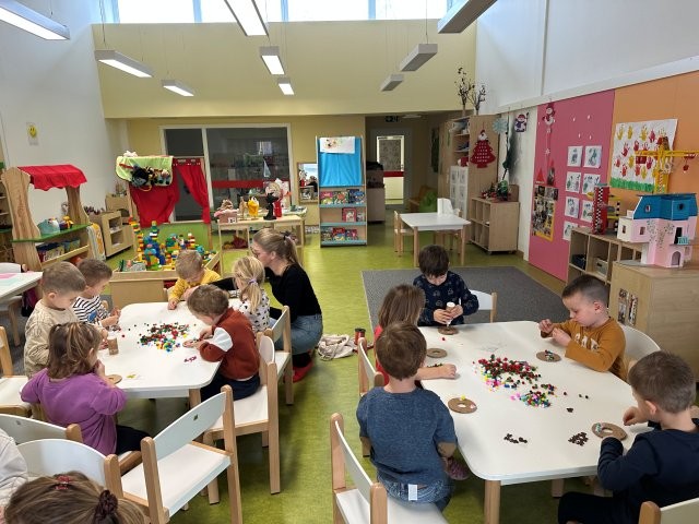 U skupini nas je posjetila gđa Basara, Liamova majka i zajedno s djecom provela kreativnu radionicu izrade božićnih vjenčića. Djeca su s velikim interesom birala pompone, ukrase i boje te ih uz pomoć ljepila slagala na svoje kartonske podloge. Aktivnost je poticala finu motoriku, koncentraciju i samostalnost, ali i osjećaj zajedništva jer su djeca međusobno dijelila materijale i ideje. Atmosfera je bila vesela i stvaralačka, a svako dijete ponosno je izradilo svoj mali božićni ukras.