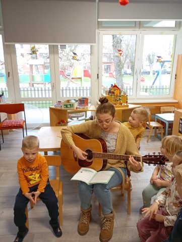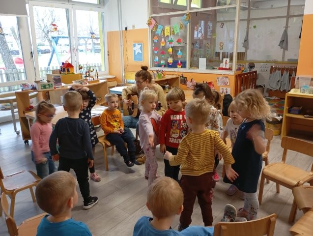 U našoj skupini posjetila nas je gospođa Vidović, Viktorova majka, koja je za djecu pripremila i održala glazbenu aktivnost. Djeca su upoznala glazbeni instrument gitaru te kroz igru i pjesmu razvijala ljubav prema glazbi. Uz pratnju gitare s veseljem su pjevala poznate pjesmice „Kad si sretan, „Proljeće”, „Jedan mali pauk” te brojala omiljene brojalice „Pliva patka”, „Išo medo u dućan”. Posebno ih je razveselilo što su i sami imali priliku svirati gitaru, isprobati žice i stvarati vlastite zvukove. Vesela atmosfera, ritam i zajedničko pjevanje potaknuli su dječju radost, kreativnost i međusobno druženje.