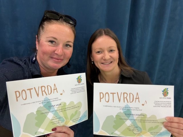 Odgojiteljice Elena Vasik i Slađana Doležal uspješno su završile edukaciju Stručno razvojnog centra za poticanje razvoja glazbenih sposobnosti i stvaralaštva djece rane i predškolske dobi u Dječjem vrtiću Špansko.