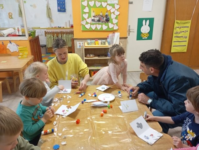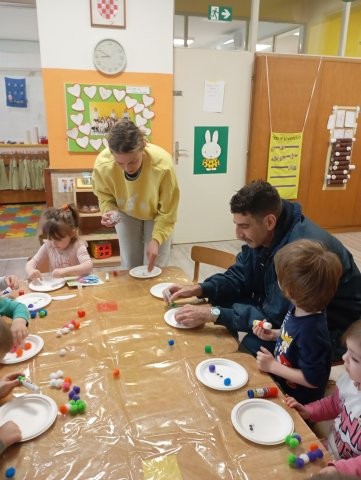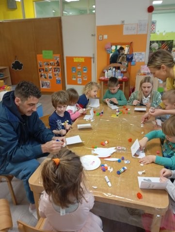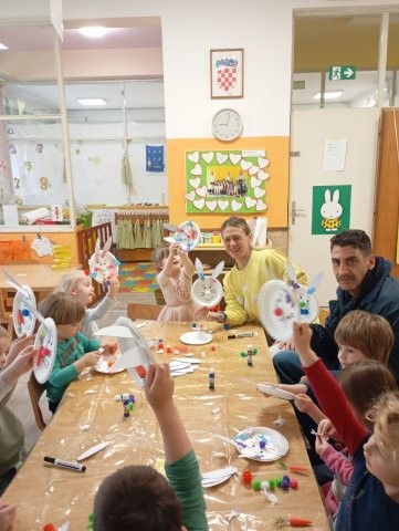 U veselom i poticajnom okruženju djeca su s velikim zanimanjem sudjelovala u kreativnim aktivnostima: ukrašavala su uskrsnog zeku i izrađivala prigodne čestitke. U radu su koristila različite materijale poput ukrasnog papira, naljepnica, pompona, razvijajući pritom svoju maštu, kreativnost i finu motoriku.