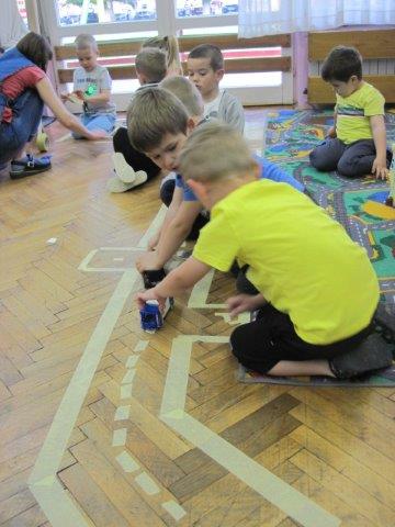 I mi, djeca mlađe b skupine, počeli smo se kretati gradom. Promatrali smo vozila i pješake u prometu. Kroz priču "Semafor koji nije htio svjetliti" i pjesmicu "Semafor" usvajali smo osnove kretanja gradom. Na podu sobe dnevnog boravka napravili smo cestu na kojoj smo proigravali što smo naučili.