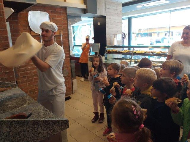 U suradnji s Zarinom mamom, gđom Tihanom Pavić, djeca starije B skupine Maslačka posjetila su pekaru. Djeca su imala priliku vidjeti kako se peče kruh, peciva te radi burek i pizza.