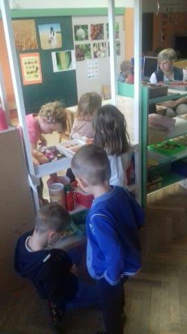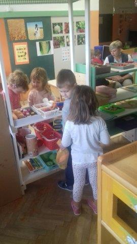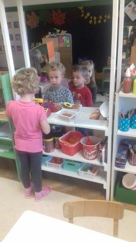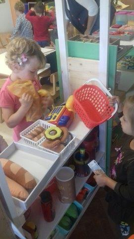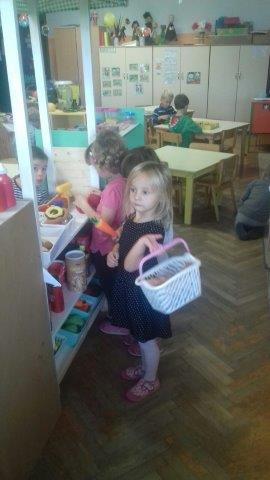 Tijekom tjedna izrađivali smo dodatna sredstva kako bi upotpunili naš novi centar; šivali smo voće, povrće i pekarske proizvode od filca, pripremili cjenik sa ilustracijama što se nalazi u trgovini i izrezivali „novac“ od starih kalendara. Roditelji također pomažu u obogaćivanju centara donoseći svakodnevno razni pedagoški neoblikovani materijal.