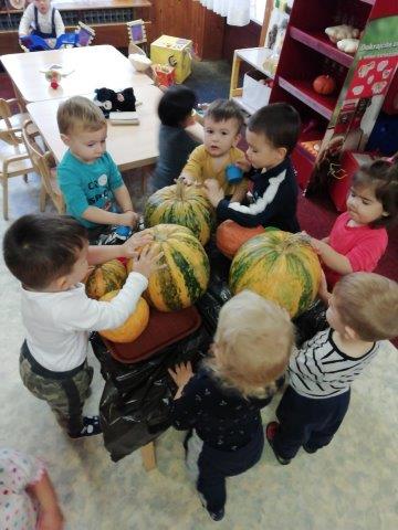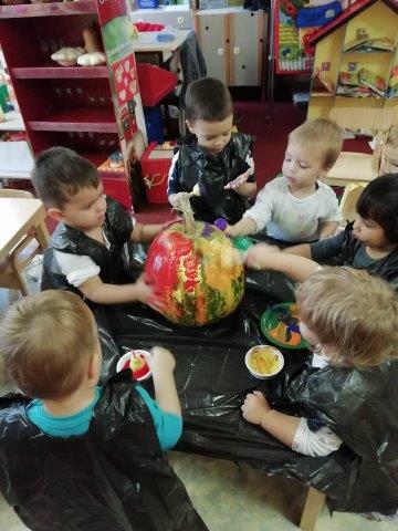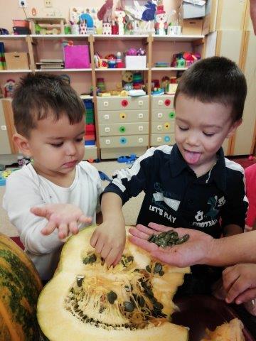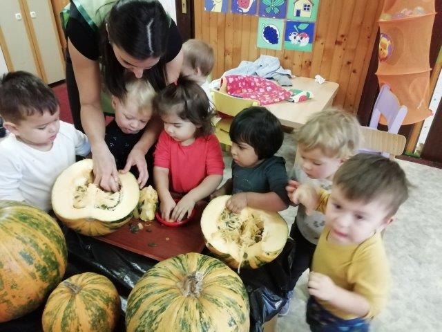 U suradnji s roditeljima prikupili smo velik broj raznovrsnih jesenskih plodova koje smo djeci ponudile na istraživanje. Posebno zanimljive djeci su bile velike bundeve kojima su manipulirali na razne načine, opipavali ih, koturali te sjedili na njima. Kako bi obogatile igru i potaknule razvoj svih osjetila, bundevu smo razrezali. Djeca su upoznala unutrašnjost bundeve osjetilom mirisa i dodira vadeći koštice te opipavajući teksturu. Kreativno izražavanje potaknule smo nudeći im spužvice i boju za otiskivanje kojima su oslikali bundeve.