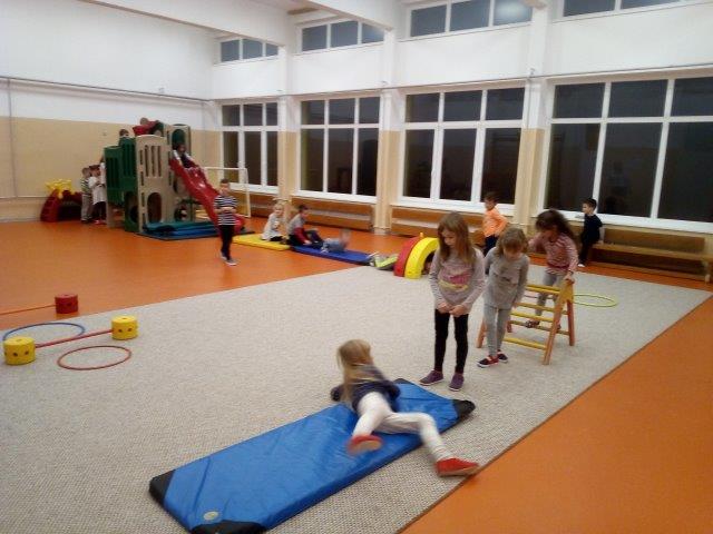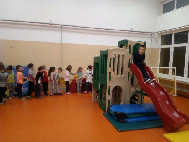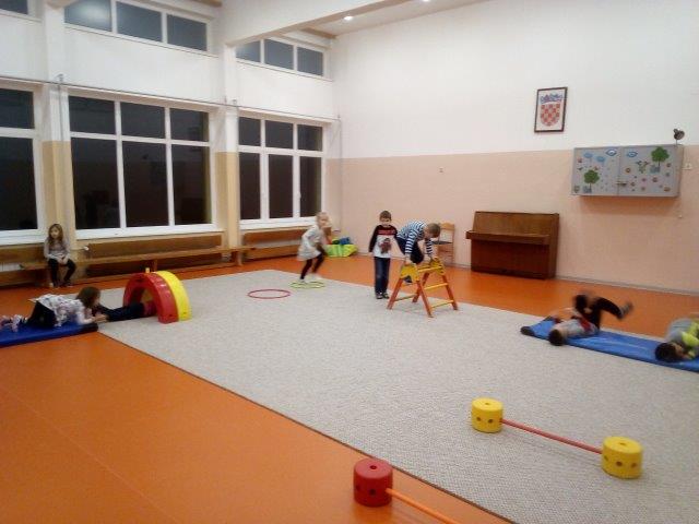 Djeca predškole "B" vesele se igrama u dvorani, a posebno različitim načinima kretanja preko malog poligona.