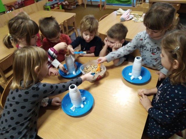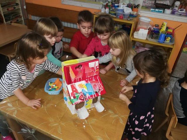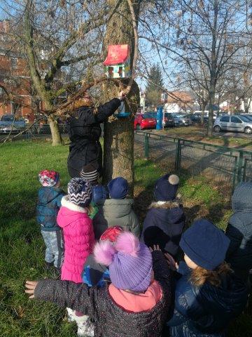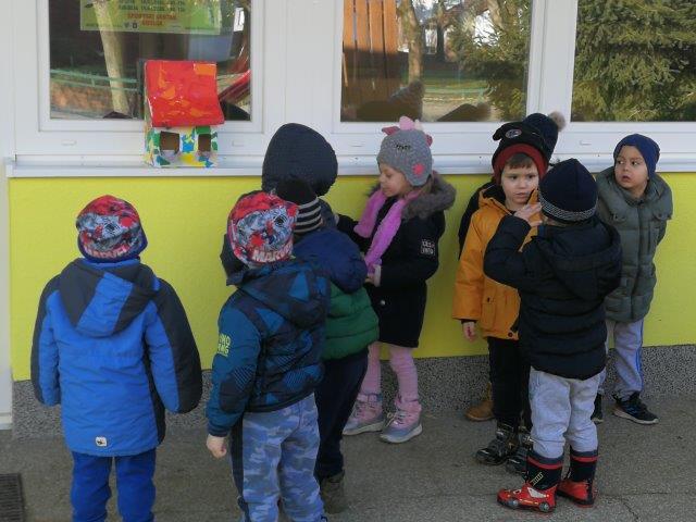 Potaknuti pričom djevojčice Helene kako s tatom hrani ptičice i velikim interesom druge djece odlučili smo pročitati priču "Miffy na snijegu". Tara je rekla kako ptičica plače jer je vani zima, a nema kućicu.  Djeci smo ponudile PNM materijal od kojeg smo izradili kućicu za ptice te hranilice koje su djeca napunila sjemenkama. Hranilice smo iznijeli na igralište vrtića.