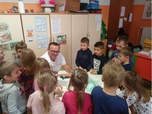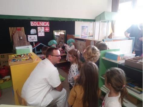 U sobi dnevnog boravka organizirali smo “CENTAR LIJEČNIKA” gdje smo poticali imitativnu igru, međusobnu suradnju i izmjenu uloga liječnik - pacijent. Posjetio nas je otac djevojčice Iris, koji je medicinski tehničar pa je vodio igru u centru liječnika što se djeci jako svidjelo. Djeca su postavljala pitanja na temu vađenja krvi, davanje injekcija i sl.