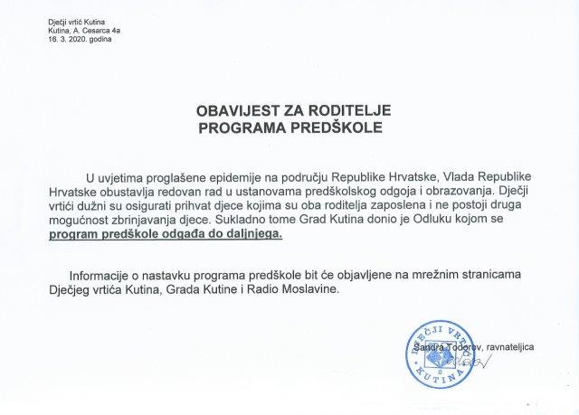OBAVIJEST RODITELJIMA PROGRAMA PREDŠKOLE