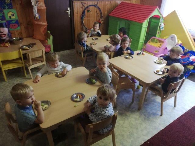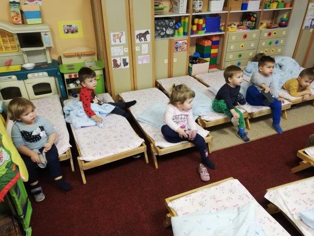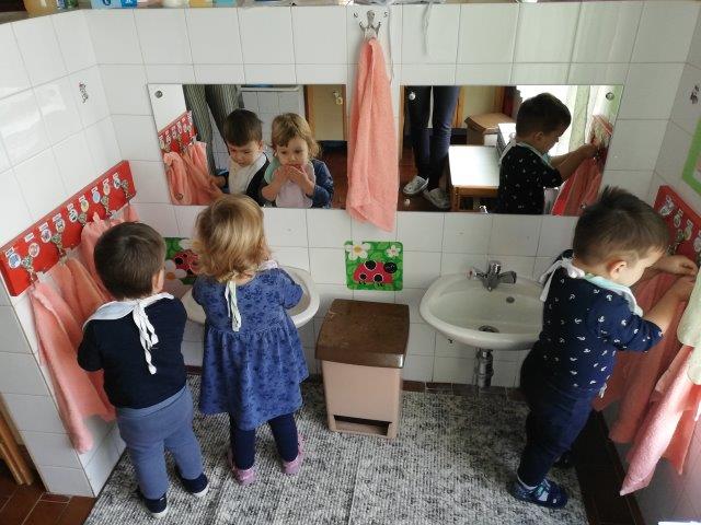 U našoj skupini nakon razdoblja prilagodbe započeli smo s provođenjem životno-praktičnih aktivnosti. U početku smo krenuli od jednostavnijih radnji kao što je sjedenje za stolom u vrijeme obroka što je za većinu djece bila teška zadaća. Za vrijeme obroka poticale smo ih na samostalno uzimanje obroka žlicom kao i uzimanje napitka iz šalice. Svakodnevno ponavljanje radnje, kao i imitativne igre u kutiću kuhinje (hranjenje lutke), doprinijele su usvajanju ove vještine. Svaku radnju popratile smo govorom i vlastitim primjerom jer dijete najbolje uči gledajući nas odrasle. Svakodnevno nakon objeda djecu se potiče na pospremanje šalice na kolica. Na ovaj način uživaju u omogućenoj samostalnosti, a ujedno je i korisna za stjecanje navike pospremanja. Nakon objeda odlazi se u kupaonicu. Tamo smo pokazivanjem poticale na podizanje rukava, trljanje ruku pri pranju te brisanje u svoj ručnik. Svako dijete prepoznaje svoj znak u kupaonici te ih je lako navesti da i sami obrišu ruke u njega. Nakon ručka vrijeme je za odmor. Djecu potičemo na samostalno izuvanje papuča. U početku im je bila potrebna pomoć, no svakodnevnim uvježbavanjem te gledanjem jedni od drugih ubrzo su i sami savladali ovu vještinu. Kako su postajali vještiji, papuče su počeli uspješno i obuvati. U tijeku odvikavanja od pelena, pratimo dijete i njegov individualni ritam. Potičemo ga na svakodnevno korištenje none, skidanje donjeg dijela odjeće te oblačenje. Svakom postignutom uspjehu svi zajedno se veselimo. Nakon igre zajedno pospremamo sobu i igračke. Imenujemo i pokazujemo što treba pospremiti i na koje mjesto jer svaka igračka ima svoj „kutić“. S vremenom djeca i sama na poticaj pospremaju jer ih ovakve aktivnosti vesele.