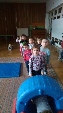 U našoj skupini svakodnevno provodimo tjelesno vježbanje. Djeca vole odlazak u dvoranu gdje su im ponuđene različite sprave, elementi i taktilne staze .Trčanje sa promjenama smjera i intenziteta kretanja veseli djecu. Jedni druge potiču na tjelesno vježbanje, izmišljaju i pokazuju vježbe koje su negdje već vidjeli prilagođavajući ih svojim mogućnostima. Penjanje i spuštanje niz tobogan, hodanje po suženim i taktilnim površinama, provlačenje, kotrljanje i kolutanje dio su pokreta koje usavršavamo. Osim kroz tjelesno vježbanje pokreti se mogu uvježbavati i kroz različite vrste pokretnih igara: „Vjetar“, „Maca i vrapčići“, „Ribari i ribice“, „Kreni-stoj“. Ove igre potiču kod djece vedru, veselu i dinamičnu atmosferu.