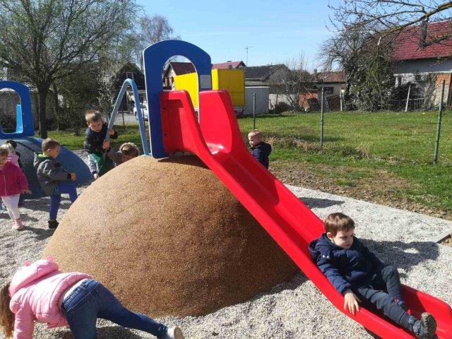 Kretanje je jako važan faktor u razvoju cjelovite dječje ličnosti, stoga nastojimo kroz šetnje i boravak na našem novom igralištu motivirati djecu da uključe sva svoja osjetila. Za vrijeme šetnji učimo hodati u paru i u koloni po različitim podlogama: neravni tereni,  livade, staza, uzbrdica i nizbrdica. Djeca imaju zadatak promatrati i uočavati prirodu, voditi računa o sebi i svojim prijateljima. Novo igralište nam je veliki izazov. Šljunčana podloga igrališta vrlo je zahtjevna za kretanje, a brežuljci stvaraju izazov i potiču ih na razmišljanje na koji način da se popnu na njih. Penjanjem bez stepenica uz korištenje samo rukohvata jačaju se velike mišićne skupine ruku  i  nogu, ali i djeca postaju snalažljiva. Javljaju se i suradnička ponašanja, jedni druge pridržavaju i poguruju, te savjetuju kako da se što lakše popnu.