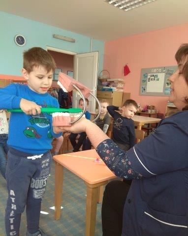 Roditelji su putem kutića za roditelje bili upoznati s planiranim aktivnostima. Postavljeni su im materijali o vrstama četkica te preporuka da kupe svom djetetu četkicu namijenjenu za njegovu dob. Nekoliko dana prije dolaska zdravstvene voditeljice, počeli smo donositi četkice za zube. Dolazak zdravstvene voditeljice te veliki model zubala i velika četkica za zube koje je donijela uvijek su za djecu zanimljivi. Pažljivo su gledala na koji način se trebaju četkati zubići i jedva su dočekala da i ona mogu isto to probati. Prvo je nekoliko dobrovoljaca očetkalo velikom četkicom model zubala, a zatim je konačno došlo na red pravo četkanje. Rasporedili smo se u kupaonici po grupicama, a četkanje zubića potrajalo je gotovo sat vremena. Djeca su upoznala pravilnu upotrebu četkice i dobila su preporuku za korištenje najkvalitetnije zubne paste za djecu. Ona im se okusom svidjela, iako većina koristi neke druge paste sa slatkim, voćnim okusima. Na kraju dana, svako dijete je ponijelo kući promotivni letak s uputama za roditelje: „Higijena usne šupljine kod djece“.